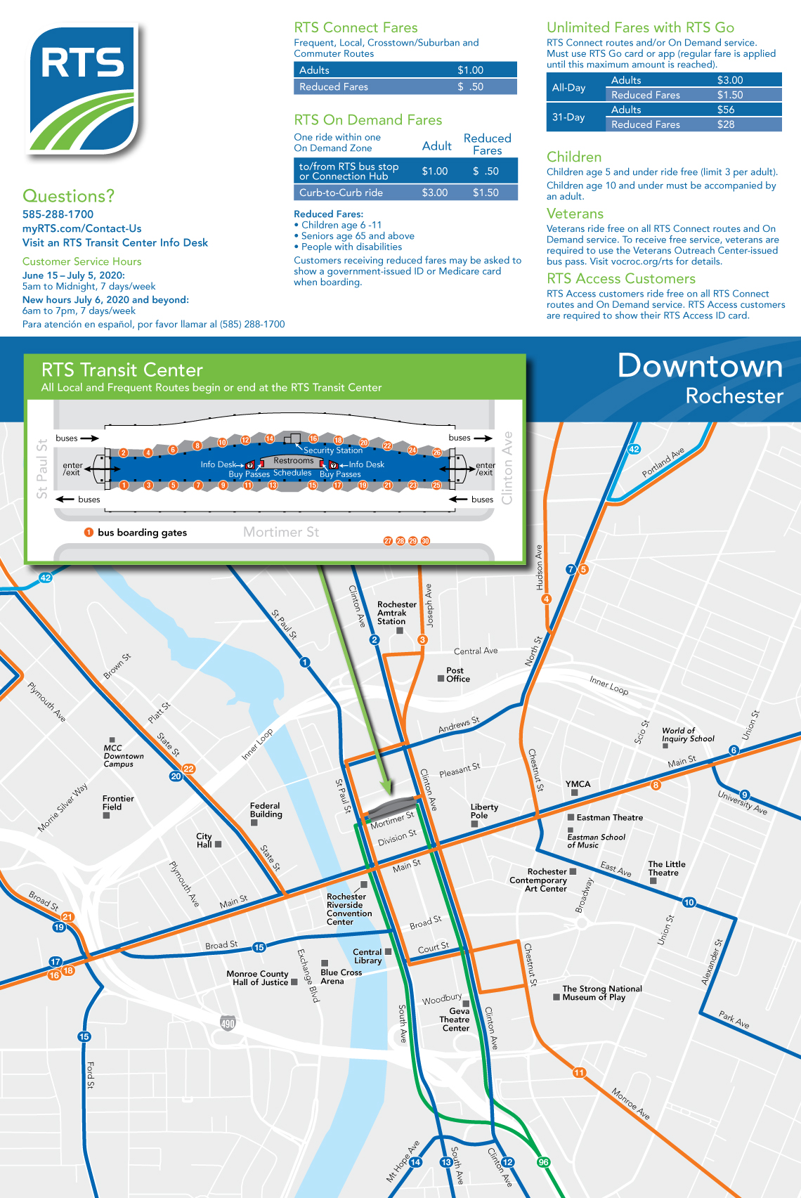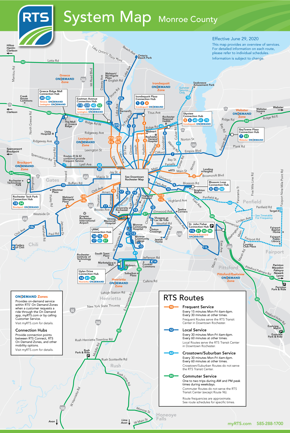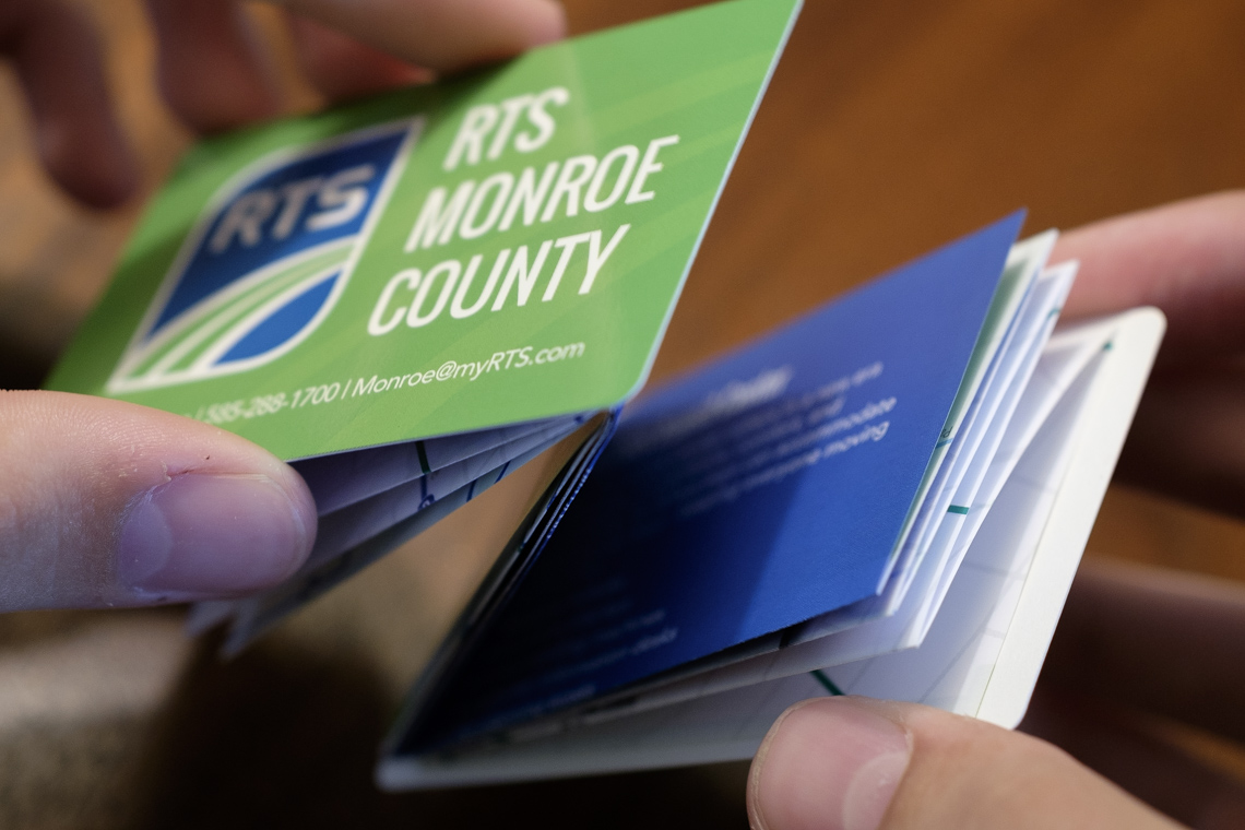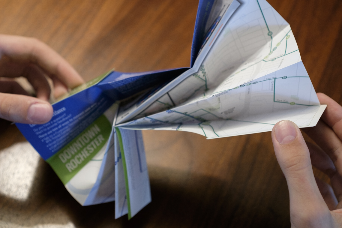 The greatest challenge of this map was to effectively communicate the large number of routes serving the city of Rochester, NY in a very small physical size that would fold into a credit-card size piece.