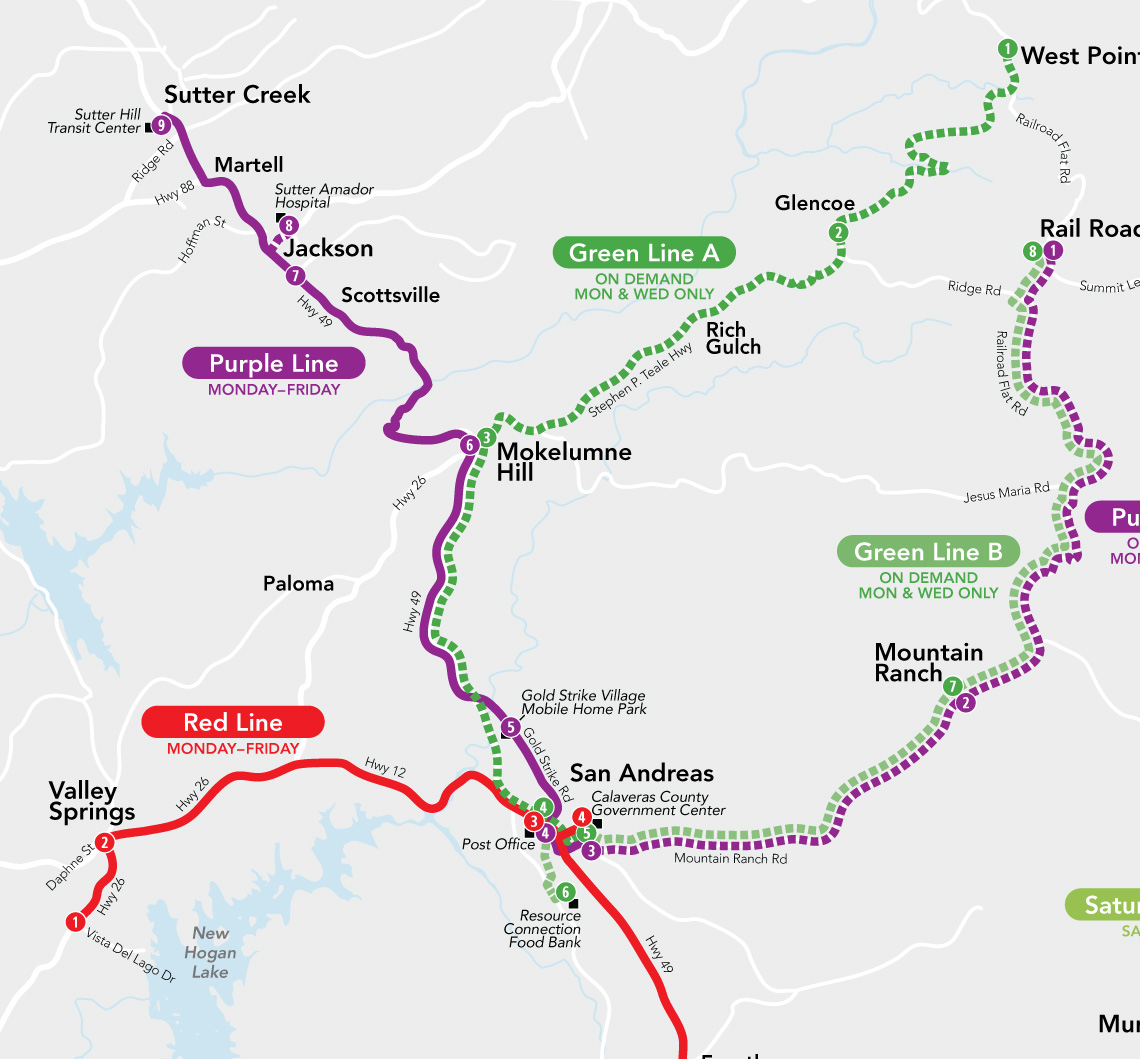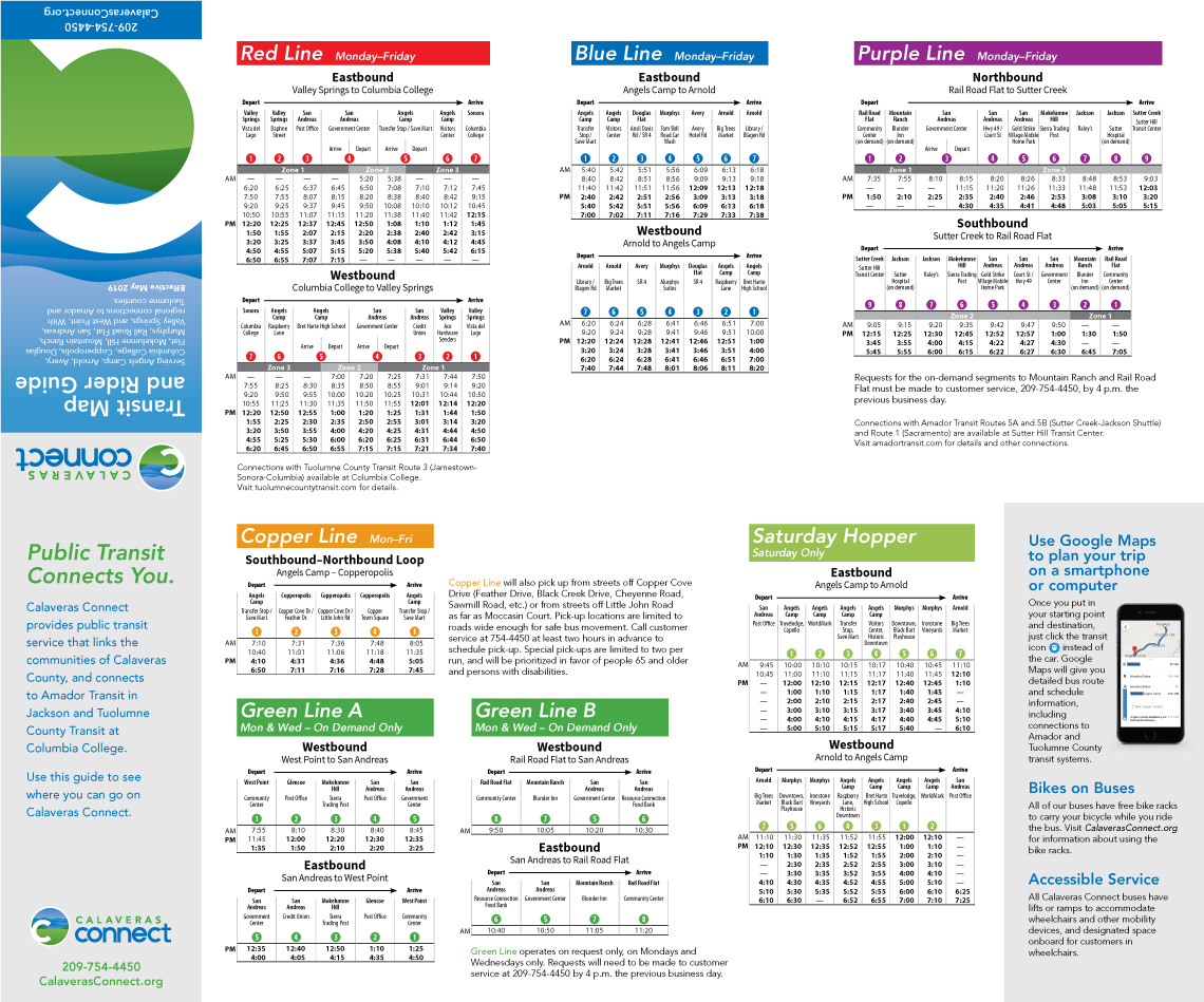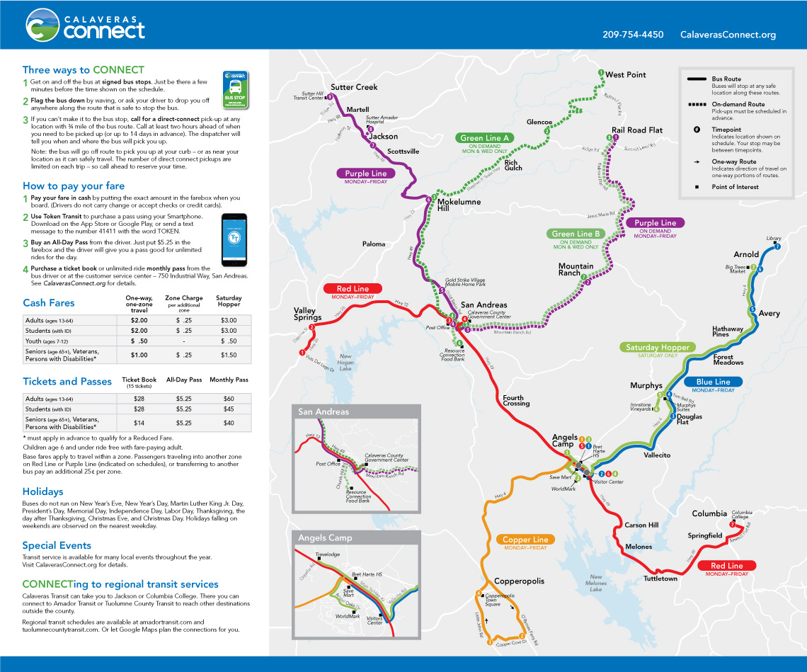 Connecting the towns of Calaveras County, Calaveras Connect provides important transit service to local residents and visitors. The map and rider guide needed to serve both of those groups of people with maps, schedules and other information that would make the system easy to understand and use.