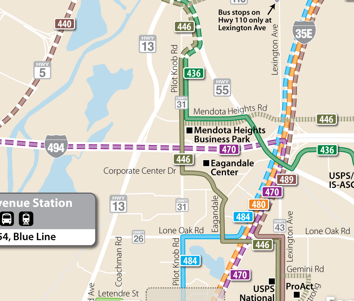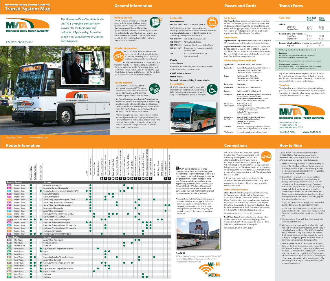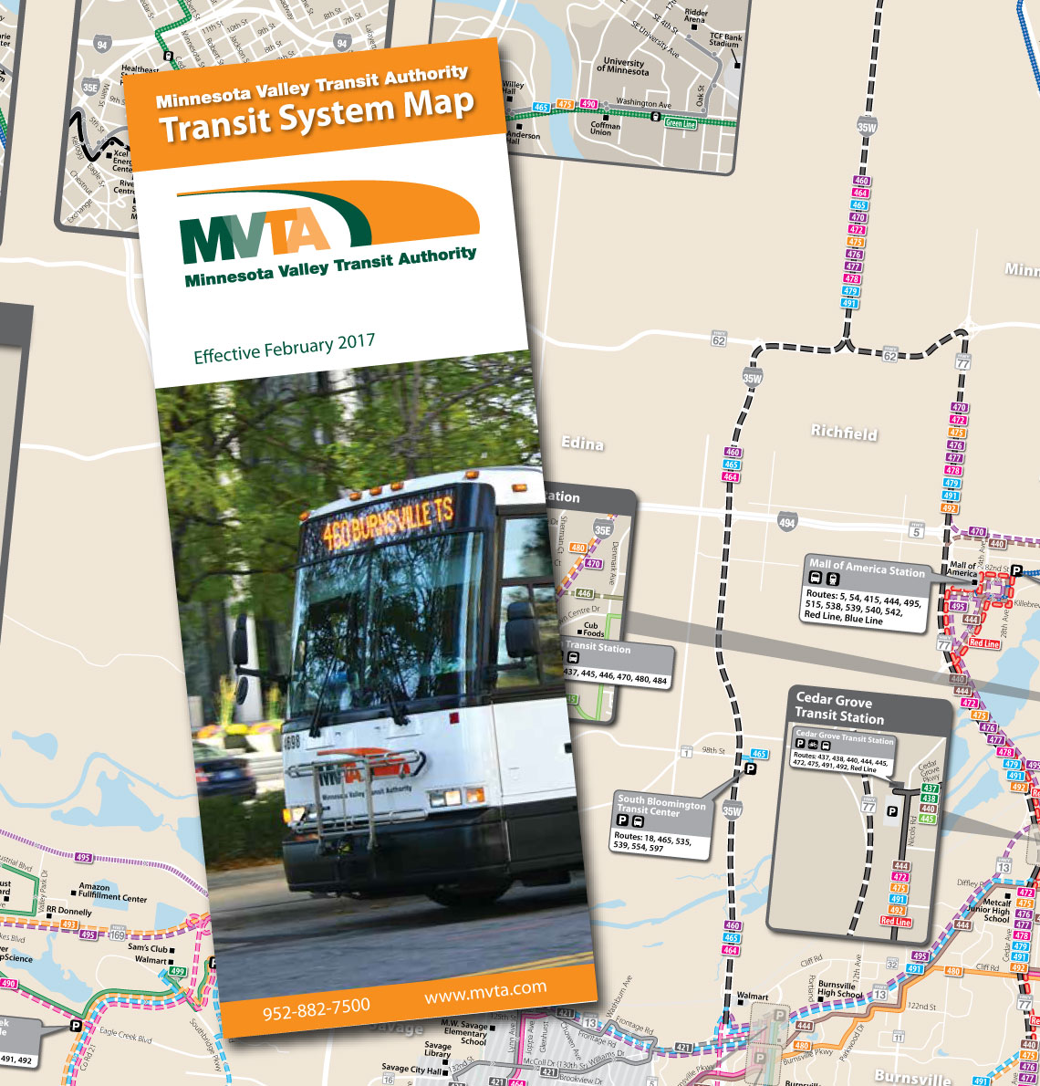 With about 25 bus routes providing local service in the Minnesota Valley area south of Minneapolis/St. Paul, service to the Mall of America, connecting service to the Hiawatha Light-Rail Line, and express commuter service to downtown Minneapolis and downtown St. Paul, the MVTA transit system map has to communicate a lot of information to a widely varying audience.