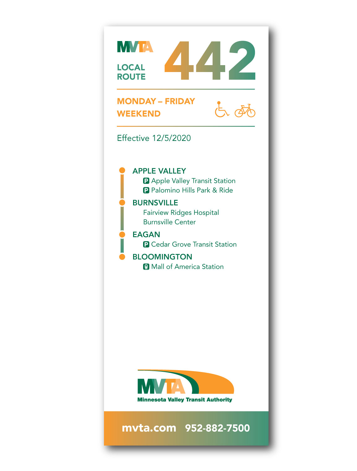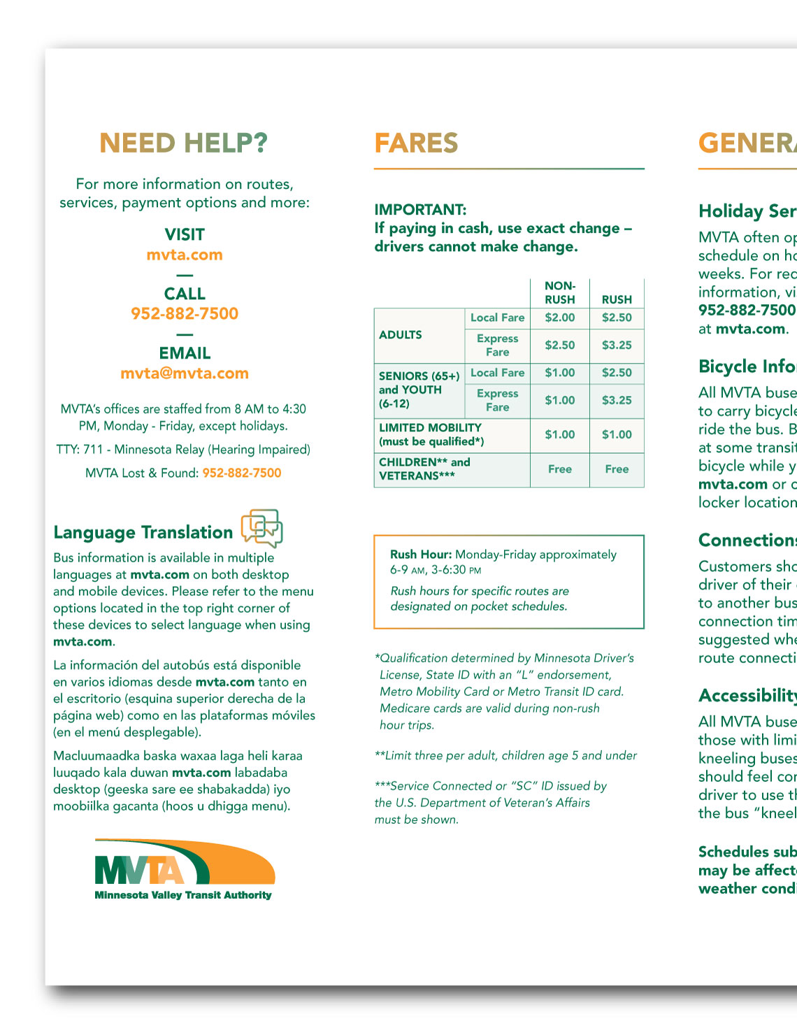 Route maps and schedule brochures for MVTA's approximately 25 routes. The design utilizes just two printing ink colors to keep printing costs down, but maximizes the effectiveness of the maps and timetables through judicious use of the colors.
