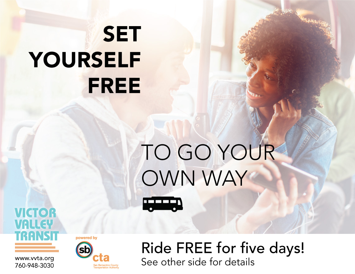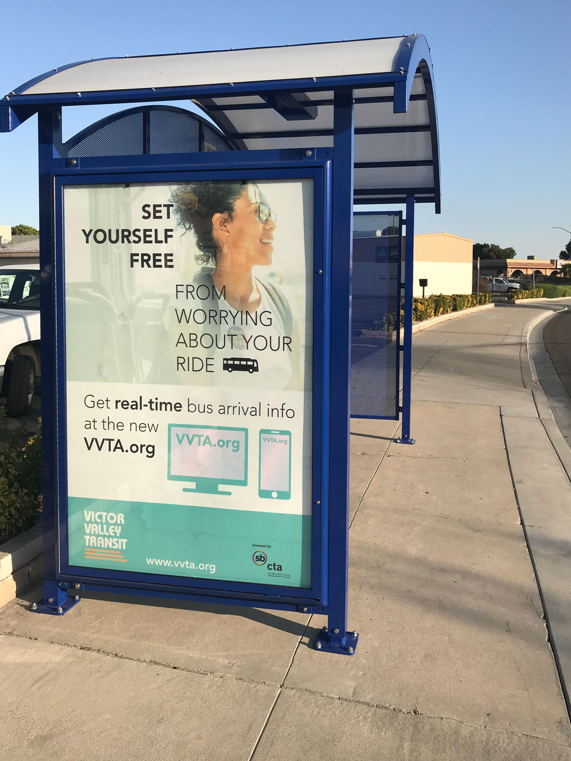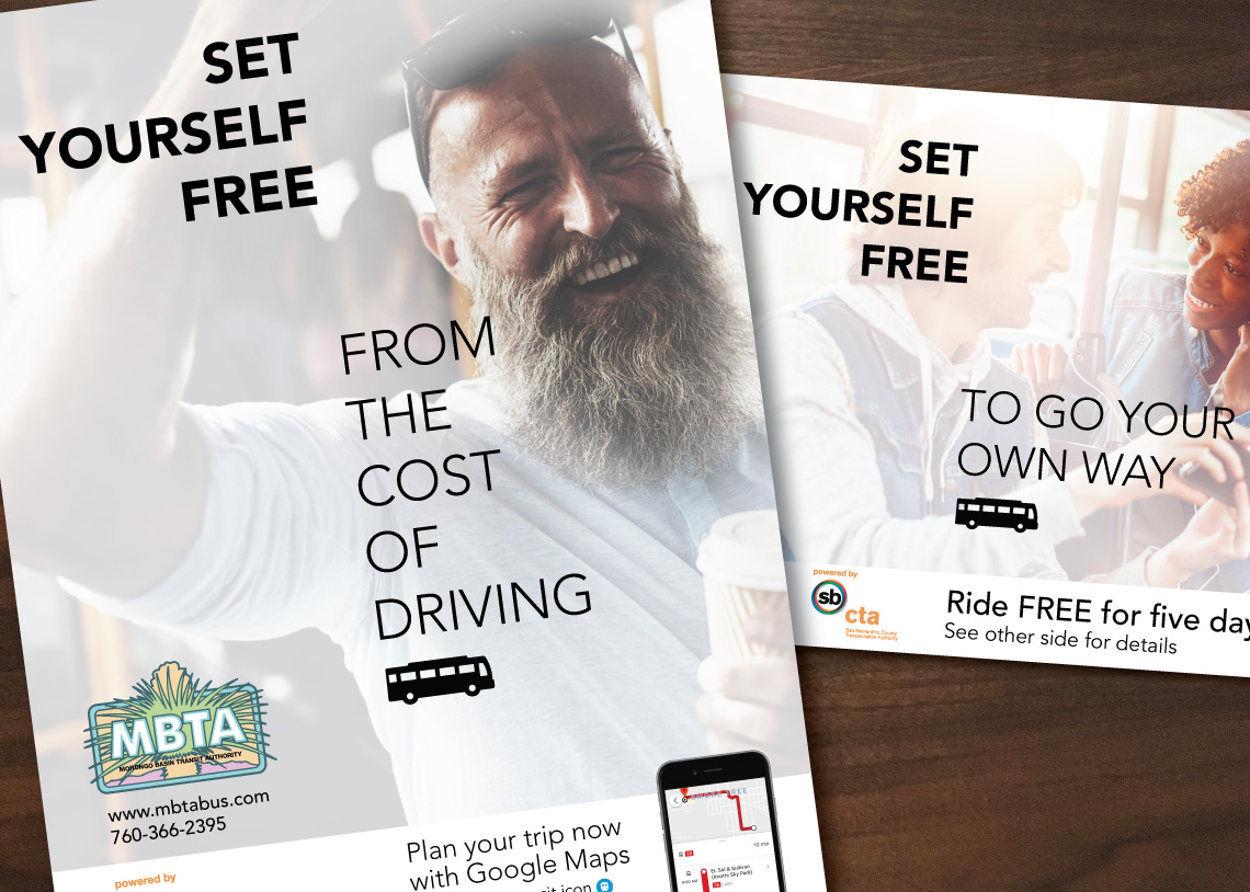 Ridership campaigns created for four transit systems in the San Bernardino Desert and Mountain Communities – Victor Valley Transit Authority, Mountain Transit, Morongo Basin Transit Authority and Needles Area Transit, in partnership with Transit Marketing, LLC.