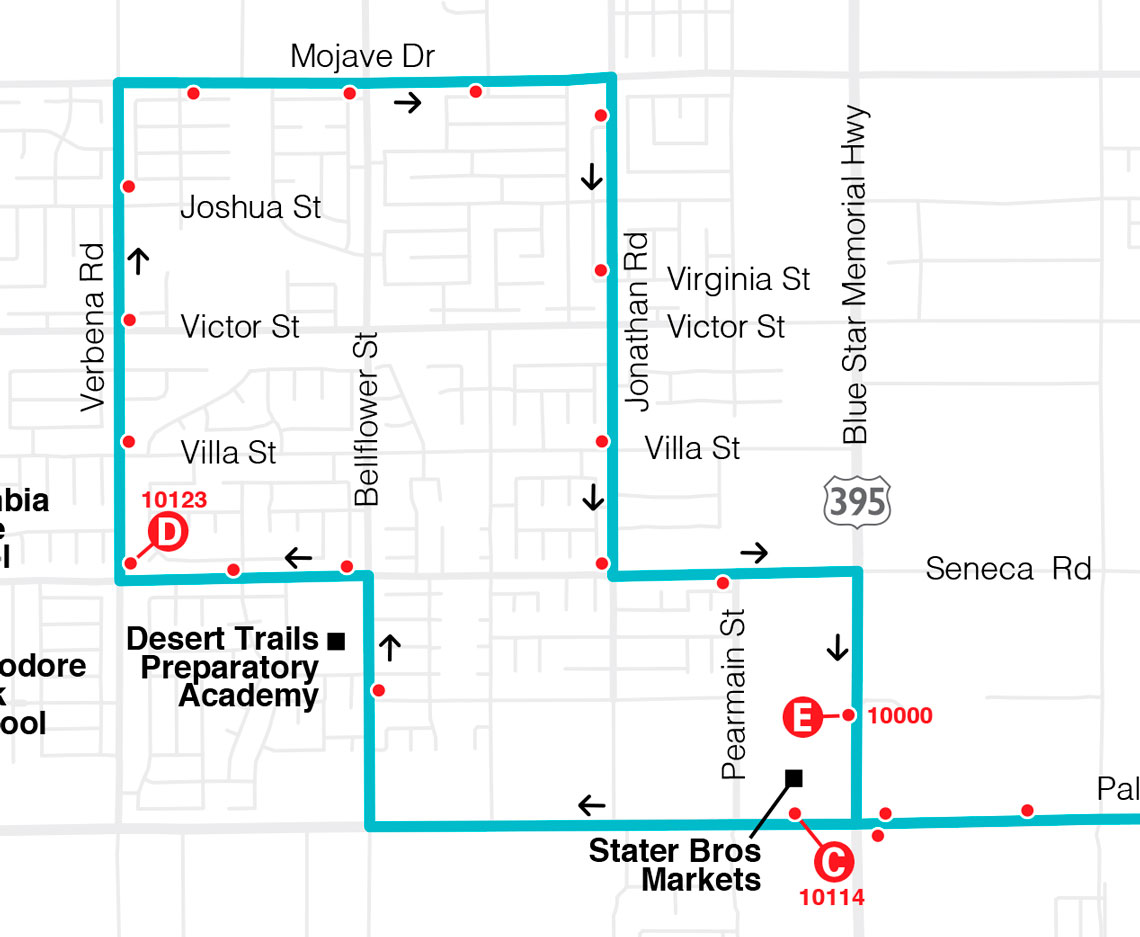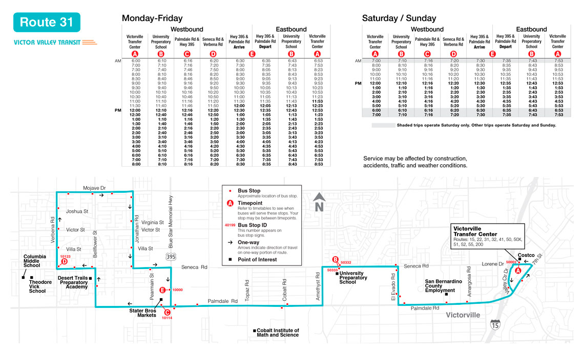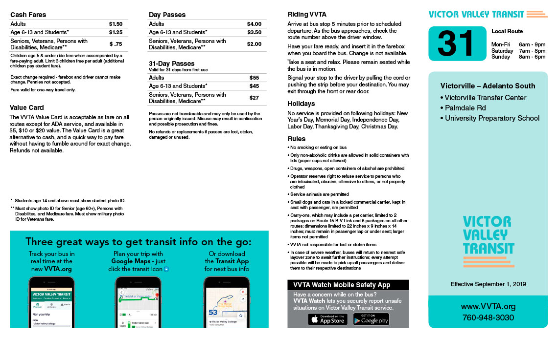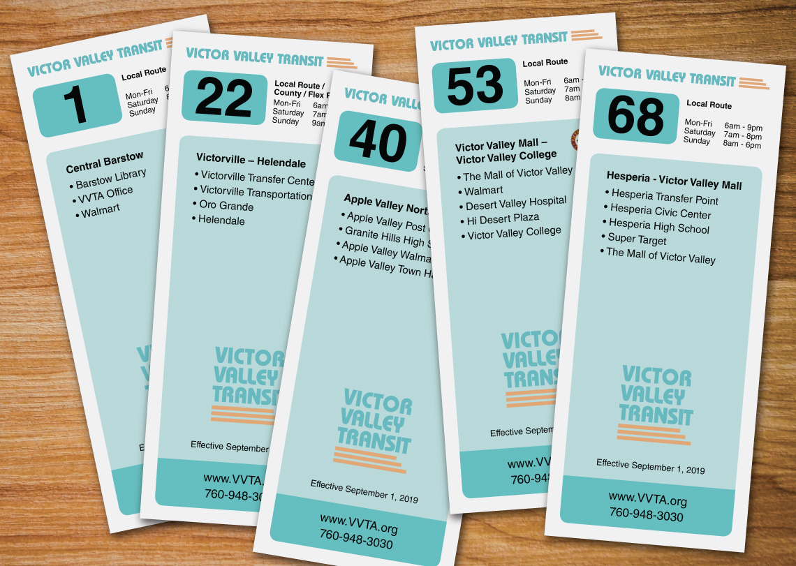 Route maps and schedule brochures for each of approximately 30 routes in the VVTA service area.